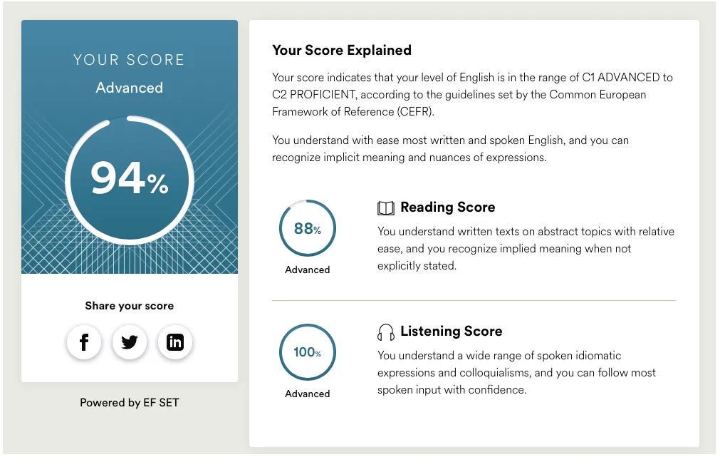 Take the quick 15-minute English quiz and screenshot the results (like the image to the right). Once you have the screenshot, please select the correct level from your results and upload the image in the application form below.
