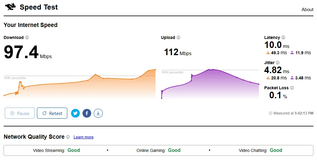 Run a quick internet speed test and capture a screenshot of the results (like the image to the right). Be sure your screenshot includes the "Your Internet Speed" and the "Network Quality Score" sections, just like it does in the example to the right. Once you have the screenshot, please upload it in the application form below.